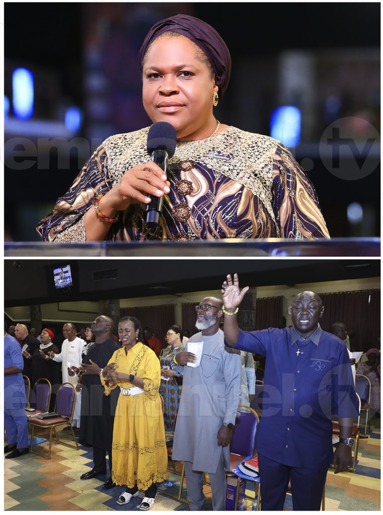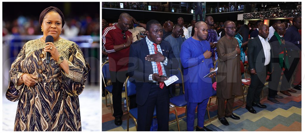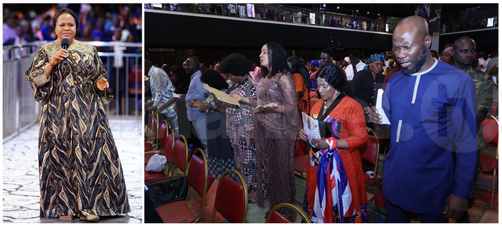Before leading the saying of The Grace at The SCOAN Sunday Service, Pastor Evelyn Joshua prophesies upon the people: “The door that God has opened for you today – nothing shall close it, in the name of Jesus Christ!”