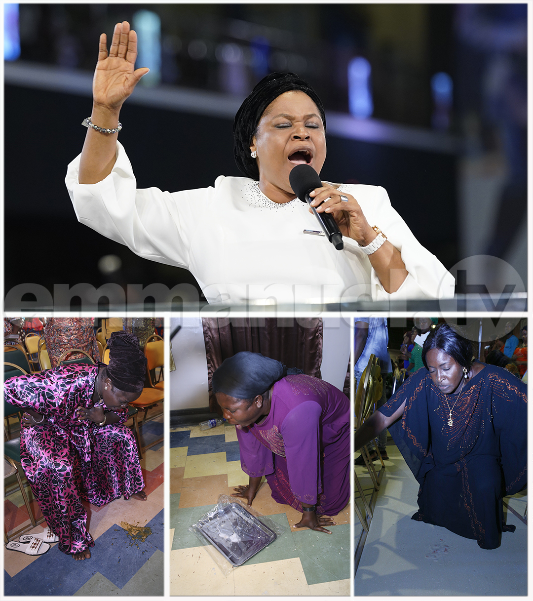 Before being joined by the evangelists, the woman of God ministered prayers of healing and deliverance to cases including prostate cancer, mental illness, difficulty in walking, leg ulcers, epilepsy and skin disease. While receiving from the Lord, some of the people vomited the root causes of problems in their systems. A man suffering from prostate issues urinated right after receiving prayer. Before, he had been unable to urinate easily.